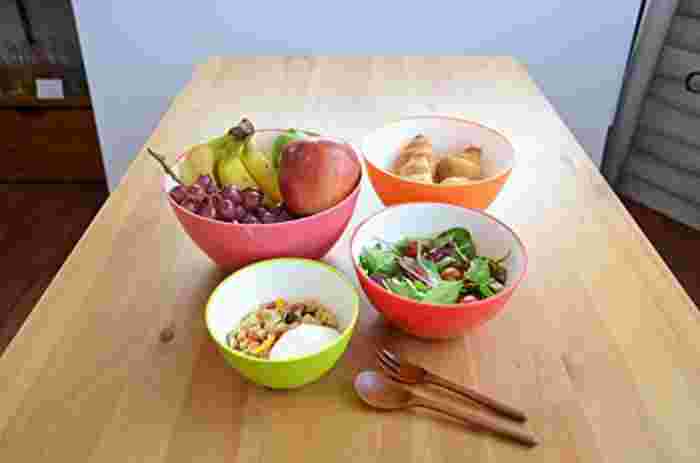 シービージャパンのプラスチック製耐熱ボウルは、割れにくく軽いので小さな子供のいる家庭にもぴったりです。樹脂製で割れにくいので、お手伝いを頼むときも安心してお願いできそうです。ブルーやピンクなど爽やかなカラーと模様が特徴で、そのまま食器としても活用できるので、おもてなしやパーティなどでも大活躍しそうです。耐熱温度は80度と低めなので、その点のみご注意ください。直径は12cmでお値段は378円です。