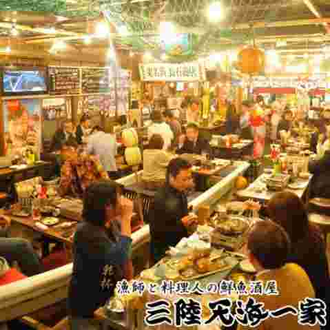 生産者から直送の三陸の海産物が中心の地産地消にこだわった、本場の浜にも負けず劣らずの元気のある居酒屋、鮮魚酒場 三陸天海一家では大小の様々なな個室から広々とした空間で、スタッフもお客も元気に過ごせる、大変活気のある居酒屋です。おすすめの海鮮は漁師のお刺身盛り合わせ2000円~で、新鮮な海鮮んを豪快に盛り付けられています。